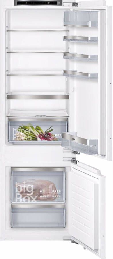 De Siemens Ki87Safe0 is een inbouwkoel-vriescombinatie met lowFrost-technologie en een hyperFresh plus-lade die groente en fruit tot wel 2 keer langer vershoudt. Dankzij de innovatieve lowFrost-technologie met speciale verdamper ontstaat er minder ijs én is ontdooien makkelijker dan ooit. Daarnaast verbruikt deze vriezer ook minder energie doordat er minder ijsaanslag ontstaat. Dit komt door de lowFrost-technologie. Hierdoor is de vriezer ook makkelijker te ontdooien. Dankzij de bigBox kan je grotere diepvriesproducten makkelijker opbergen. Wat het opbergen in het koelgedeelte makkelijk maakt, zijn de easyAccess uittrekbare plateaus. Tot slot beschikt deze koel-vriescombinatie over de opties superKoelen en superVriezen. Hierdoor komen nieuwe producten snelller op de juiste temperatuur en raken producten die erin liggen minder snel hun termperatuur kwijt.